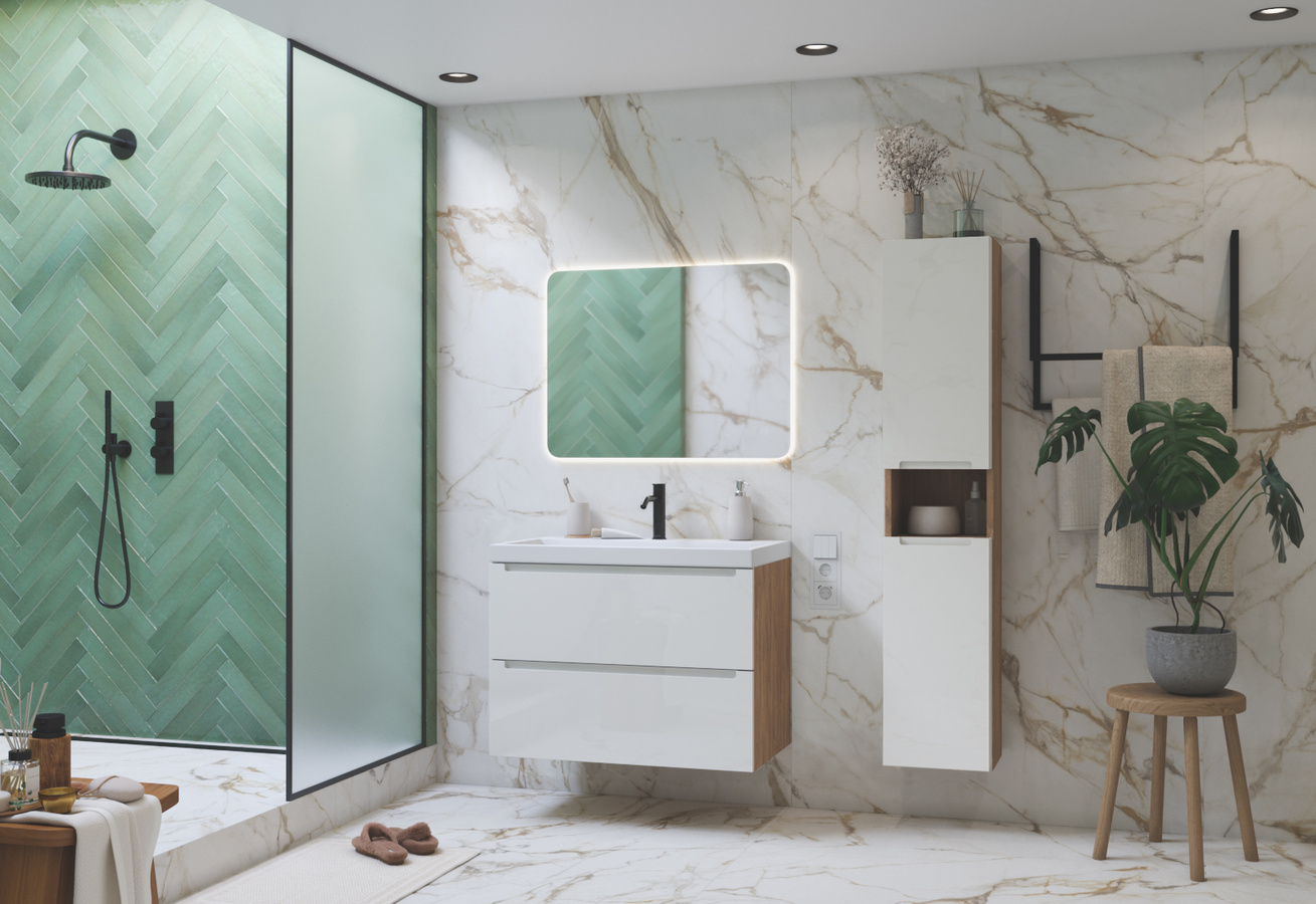 Неоспоримым преимуществом является использование в фасадах интегрированных ручек, которые отлично подходят для использования в помещениях с повышенной влажностью и создают дополнительную защиту от проникновения влаги.