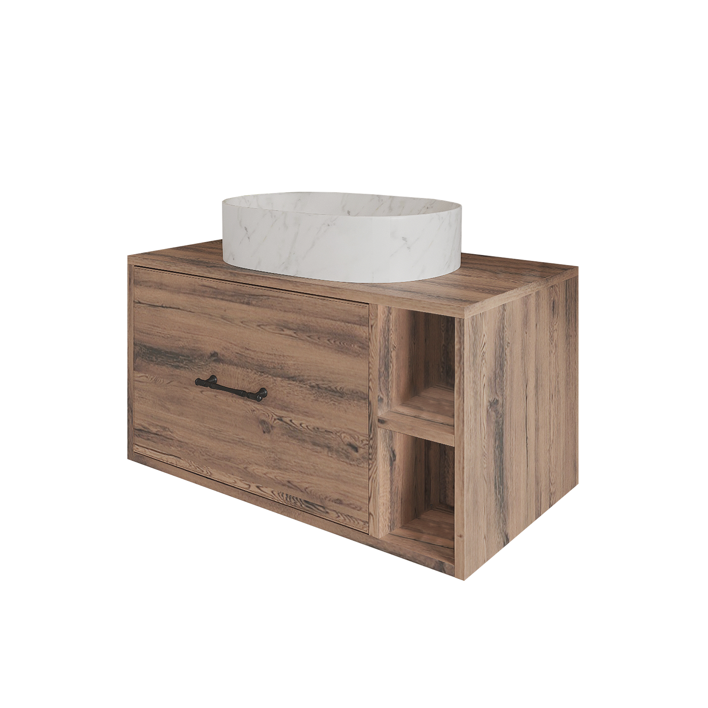 Функциональность и стиль в каждой детали. Универсальная столешница толщиной 18 мм, выполненная в том же благородном цвете Дуб Веллингтон, позволяет вам легко выбрать и установить любую раковину и смеситель. Обратите внимание: индивидуальный вырез придётся сделать самостоятельно, что дает вам возможность преобразить пространство под ваши потребности.