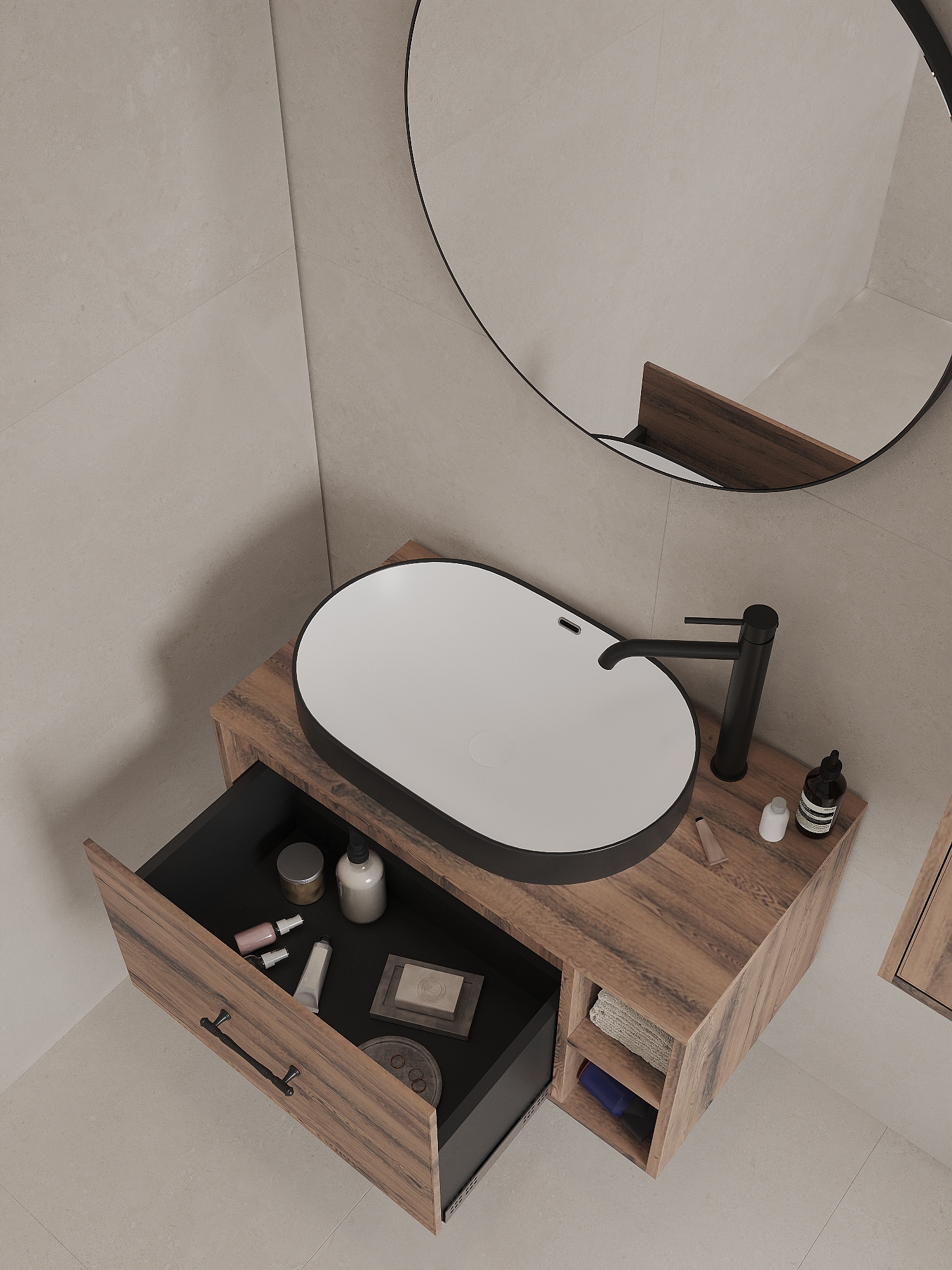 Функциональность и стиль в каждой детали. Универсальная столешница толщиной 18 мм, выполненная из ЛДСП в цвете Дуб Веллингтон, имеет один вырез, что позволяет легко установить на нее раковину Oliveeka 6002. Обратите внимание: индивидуальный вырез под смеситель придётся сделать самостоятельно, что дает вам возможность преобразить пространство под ваши потребности.
