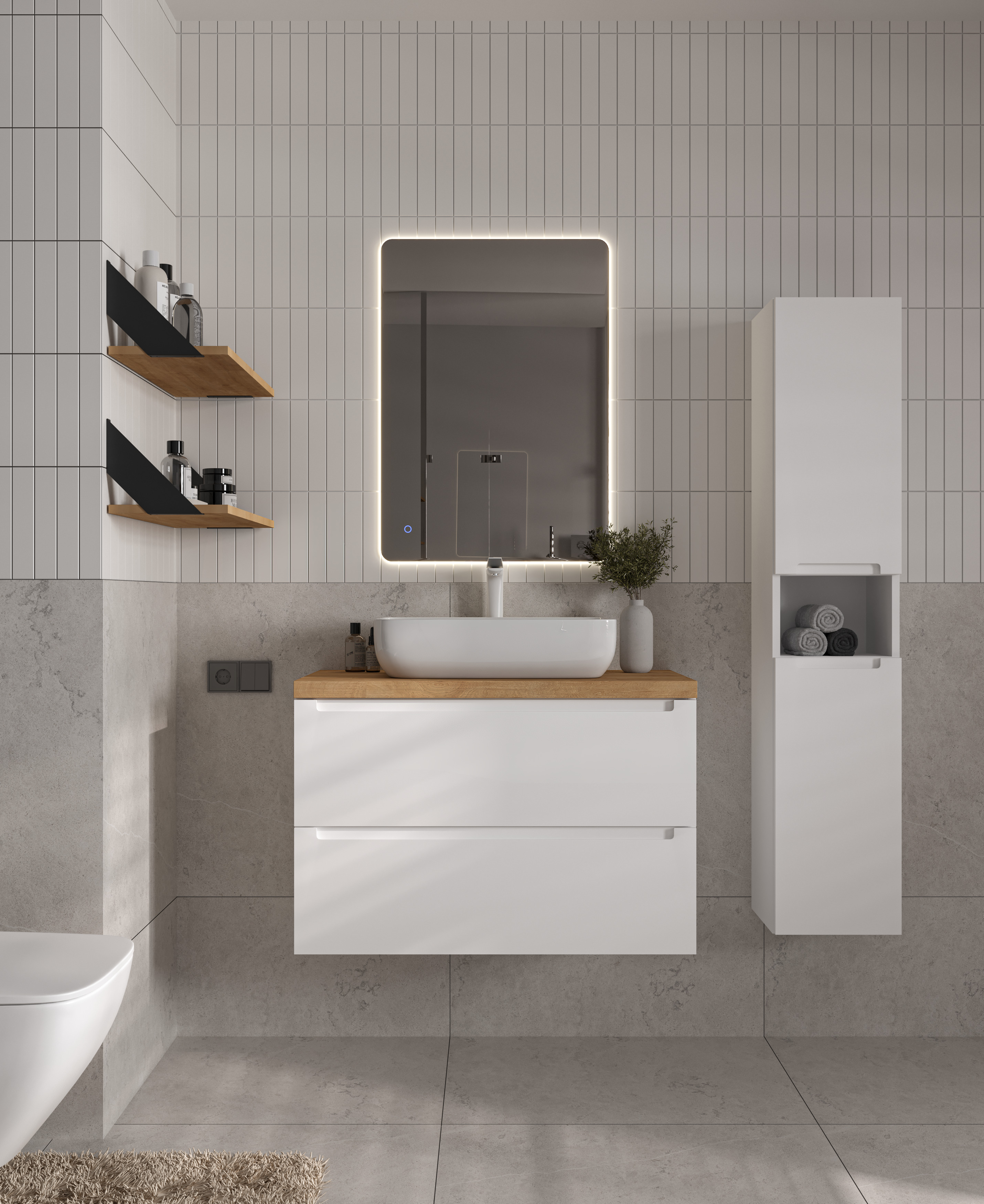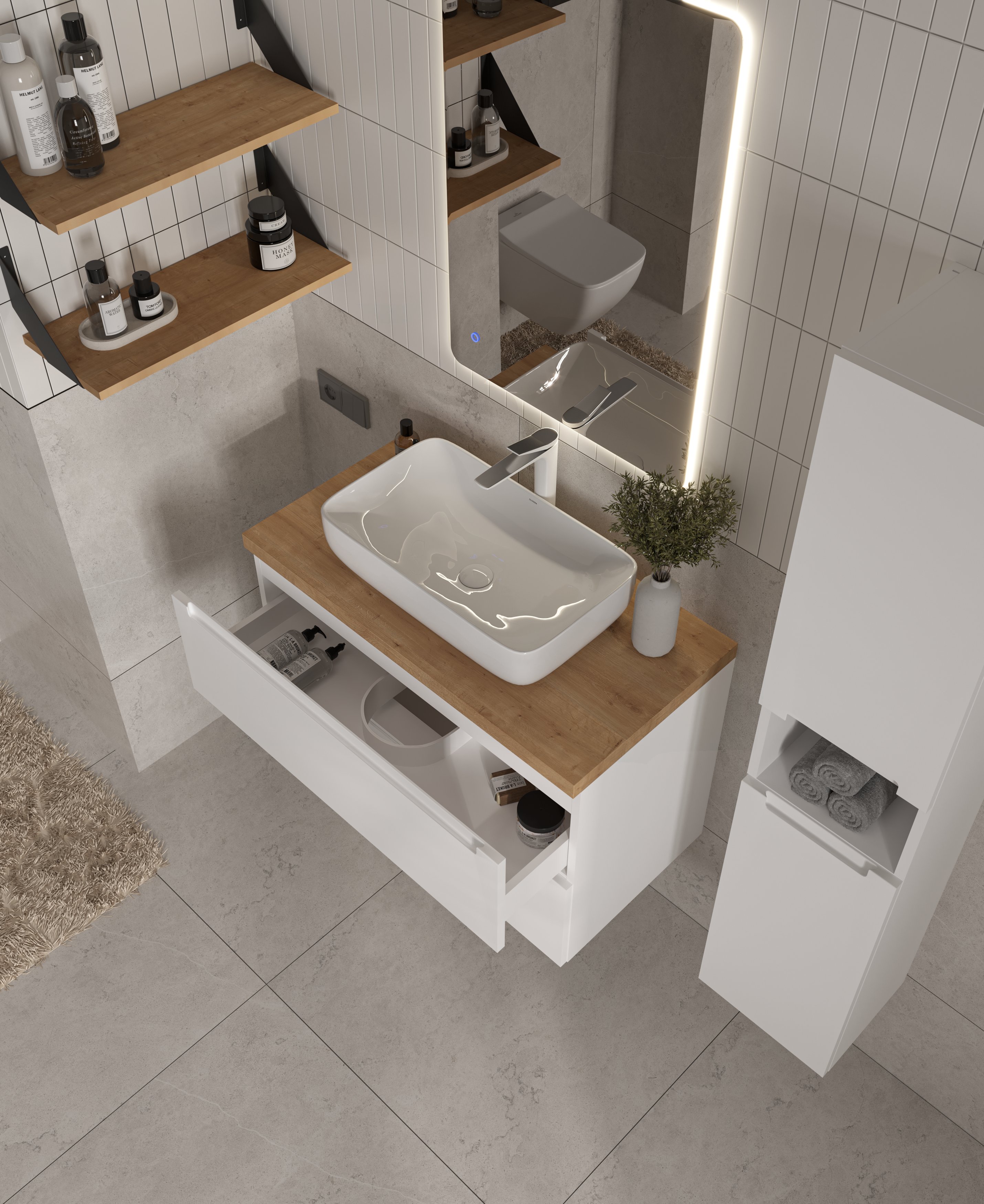 Подвесные конструкции тумб очень удобны, оставляя достаточно пространства над полом, что облегчает процесс уборки. Вместительные выдвижные ящики позволяют скрыть все необходимые средства гигиены и банные принадлежности. Система выдвижения Quadro обеспечивает бесшумное скольжение ящиков.